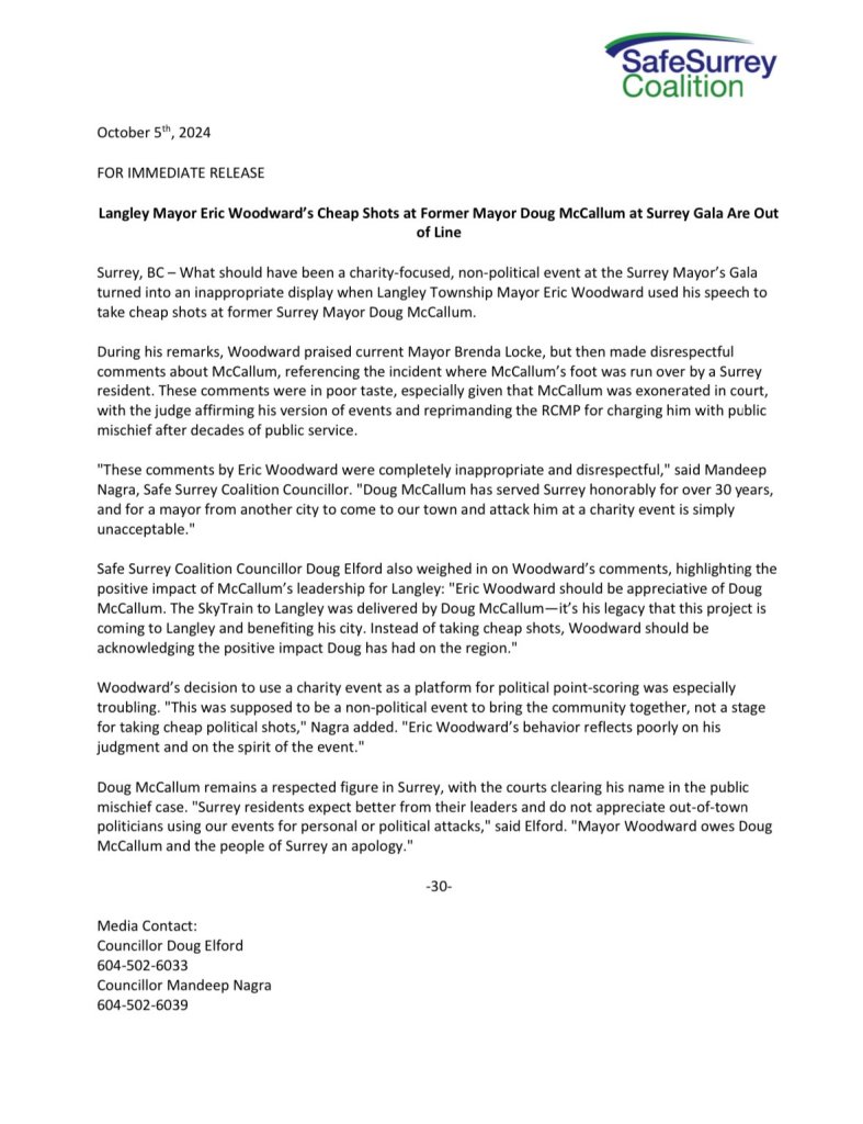 This year’s gala however, held Friday October 4, was marred by Mayor Woodward’s controversial remarks about former Surrey Mayor Doug McCallum. It is striking that Mayor Woodward took the occasion to make gratuitous personal political attacks and cause serious offence to councillors and many residents of the critically-important neighbouring city in which he was being hosted. This event focuses on solidarity, generosity and service to the less fortunate, and trying to bridge the divides in our society.