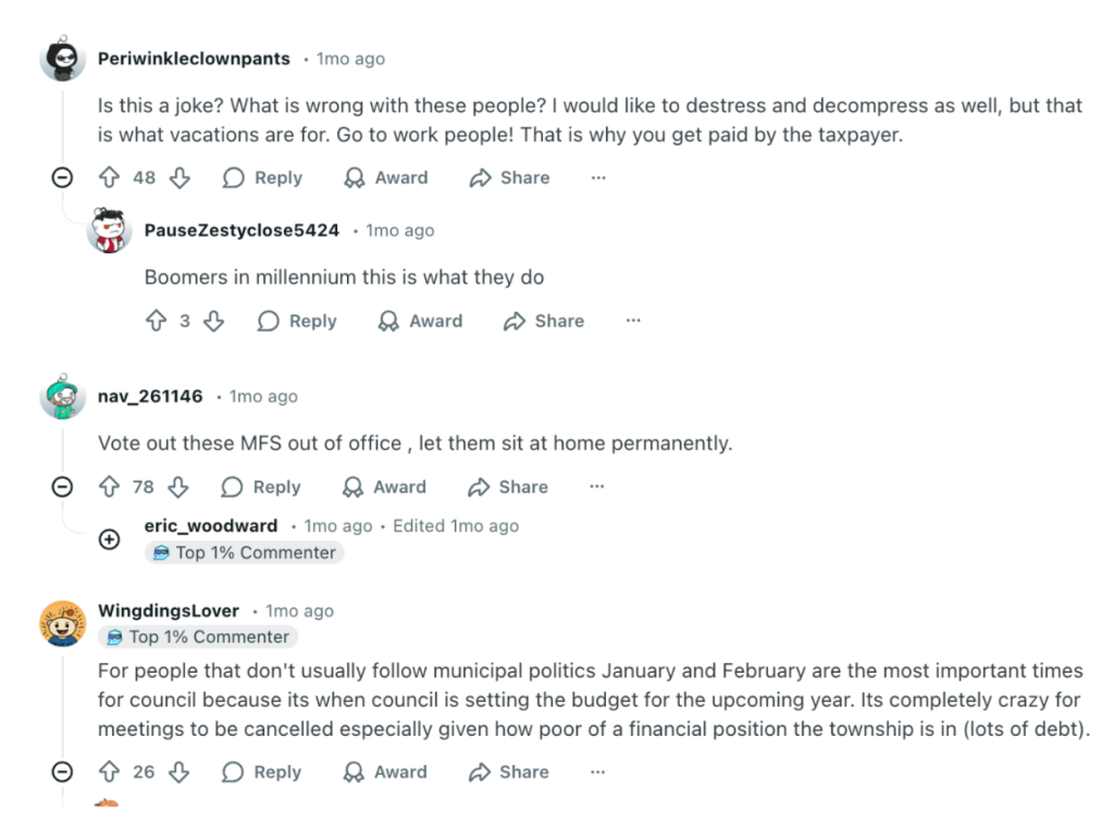 The decision was reported in the Langley Advance Times and sparked a discussion on r/Langley. Some commenters suggested the move could be seen as councillors taking time off, and several pointed out that Township staff would still be working regardless of whether council meets. Others argued that if the meeting was on the calendar then council should be there, and that regular meetings are part of how residents follow what council is doing.