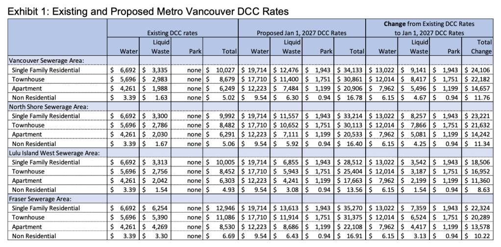 A Metro Vancouver commissioned Coriolis report estimated this change would add about $11,360 to $14,657 per apartment unit by 2027, depending on which Metro sewer service area the project is in. In the Vancouver sewerage area, the total Metro DCC on an apartment rises to about $20,906 by 2027 (up from $6,249 before the phase‑in).