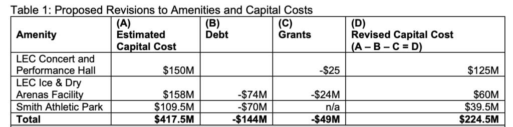 A December 2025 report to Mayor and Council on Amenity Cost Charges (ACC) provides a second list of LEC figures, showing an estimated capital cost of $150 million for an “LEC Concert and Performance Hall” and an estimated capital cost of $158 million for the “LEC Ice and Dry Arenas Facility.”