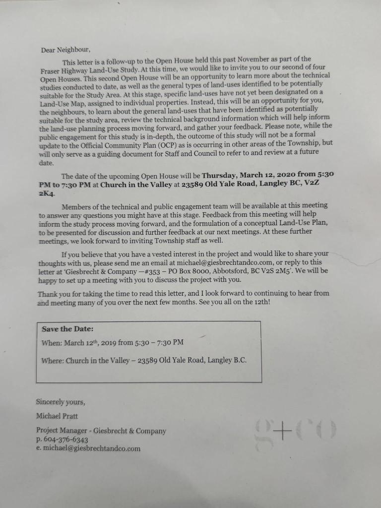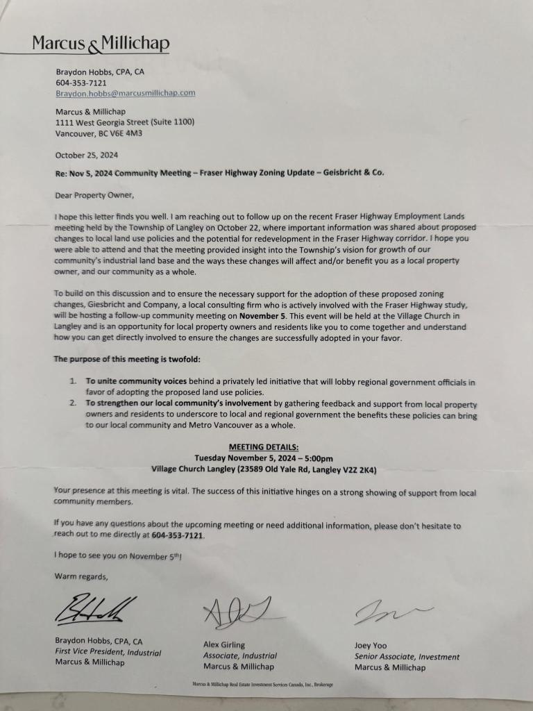 Material shared with The Langley Monitor indicates landowners also received a later Giesbrecht letter after that open house, inviting them to a Nov. 5 meeting and seeking support for proposed zoning changes. This may suggest that private advocacy and the public planning process were occurring during the same period.